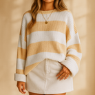 De Maud Strepentrui combineert comfort met een trendy design. De zachte gebreide stof voelt heerlijk aan en houdt je warm op frisse dagen, terwijl het vrolijke streeppatroon direct een modieuze touch toevoegt. Ideaal voor wie houdt van effortless stijl met een knus gevoel.