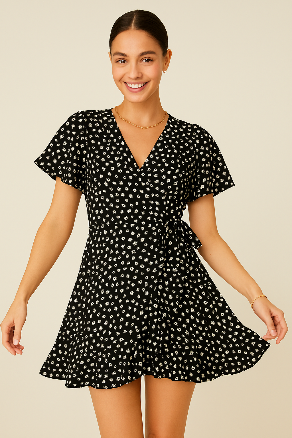 De sexy kruisnek laat je schouders en sleutelbeenderen prachtig uitkomen, terwijl de subtiele ruches aan de mouwen zorgen voor een zachte, vrouwelijke touch. Een perfecte balans tussen flirty en classy.