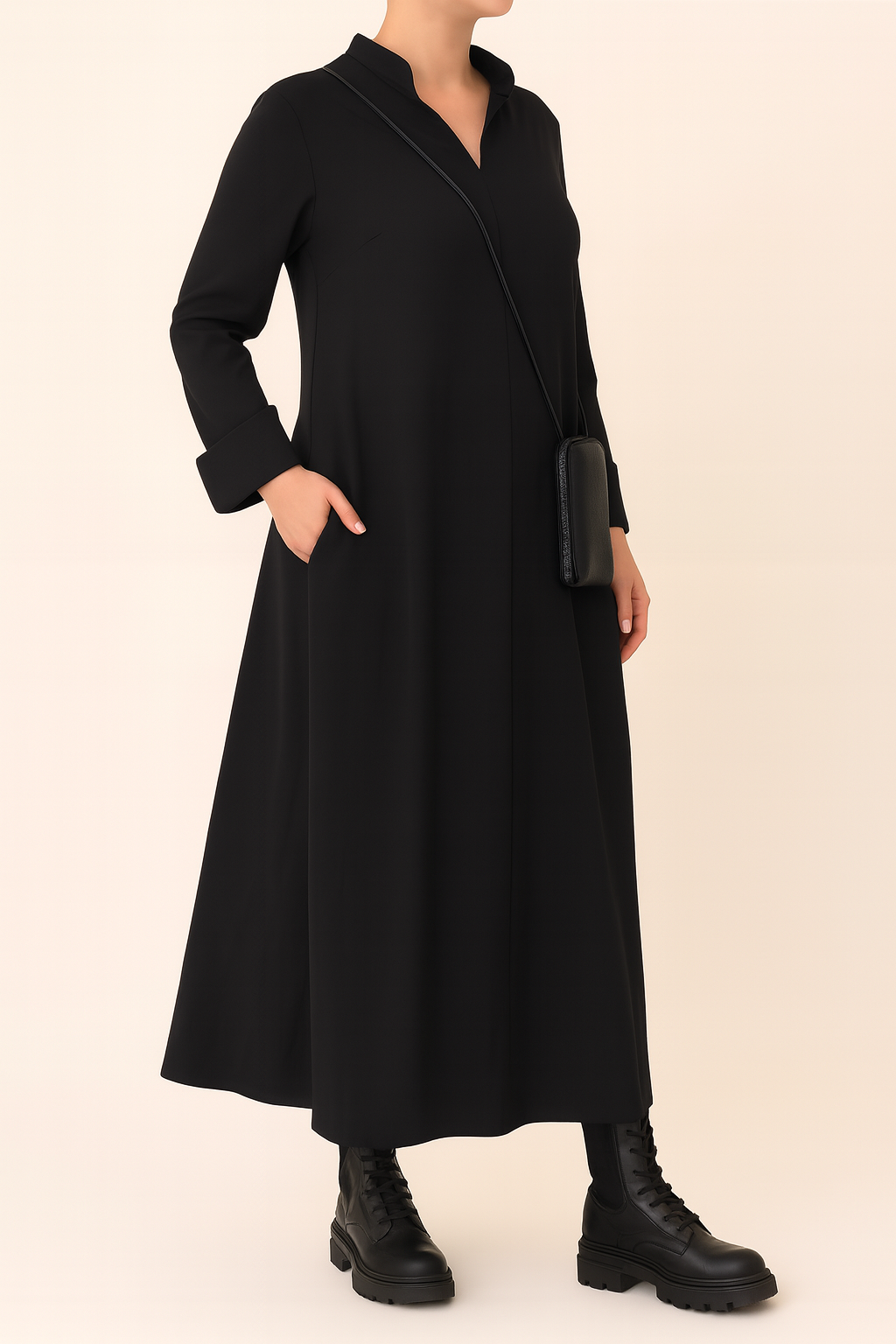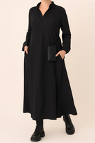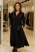 Elegant, comfortabel en moeiteloos stijlvol – de Noelle Zwarte Midi Jurk is hét perfecte item voor vrouwen die houden van een tijdloze look met een moderne twist. Dankzij de vloeiende pasvorm en subtiele kraag straalt deze jurk klasse uit, terwijl de steekzakken zorgen voor een nonchalante, comfortabele touch.