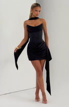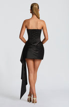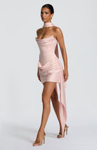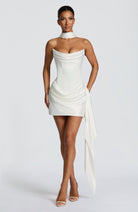 De Zara Mini Jurk combineert tijdloze elegantie met moderne allure. Het sculpted lijfje met subtiele baleinen biedt ondersteuning en vormt zich mooi naar het lichaam, terwijl de cowl-neck zacht en vloeiend langs de hals valt. De overlay-rok met diepe plooien en een gedrapeerd detail op de heup zorgt voor een uniek, vrouwelijk silhouet. De lace-up striksluiting aan de achterkant maakt de jurk volledig verstelbaar en geeft een sophisticated finishing touch.