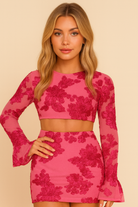 Deze stijlvolle tweedelige set bestaat uit een lange mouw crop top met open rug en een bijpassende mini rok. Gemaakt van luxe, bloemvormige kanten stof met een lichte stretch voor comfort. De transparante mouwen geven de set een verfijnde en sensuele uitstraling, terwijl de aansluitende rok je figuur prachtig laat uitkomen.