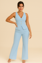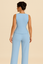 Deze set bestaat uit een high waist broek en een bijpassende top, beide gemaakt van een zachte stretchstof die zich perfect naar je lichaam vormt. De hoge taille creëert een flatterend silhouet, terwijl de minimalistische snit zorgt voor een moderne en veelzijdige look.
