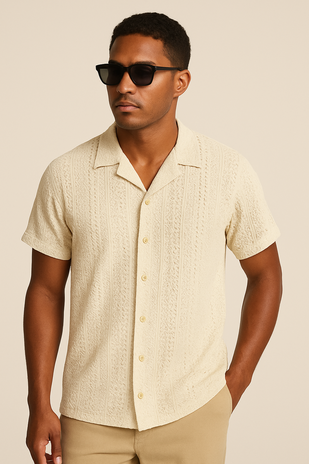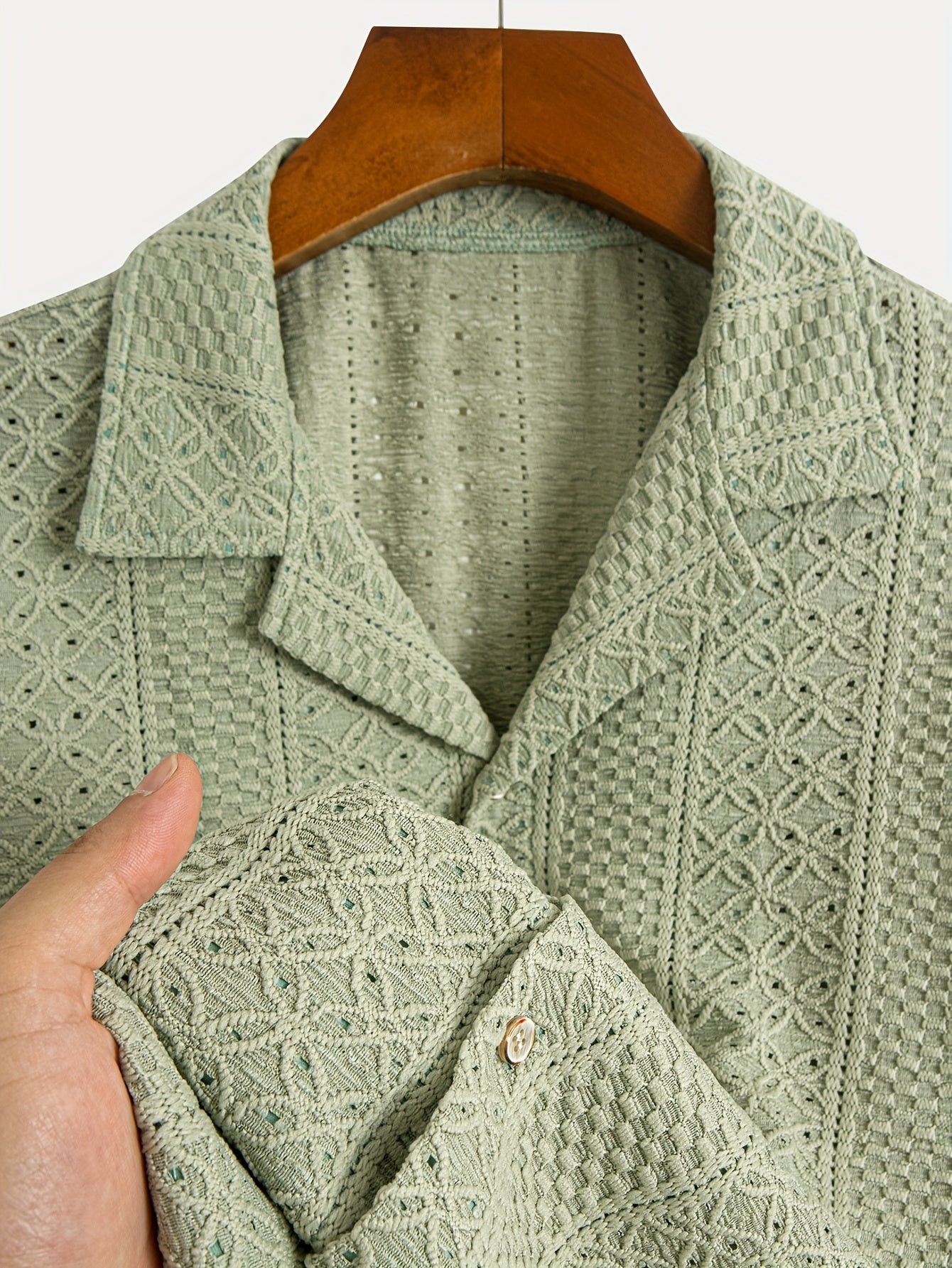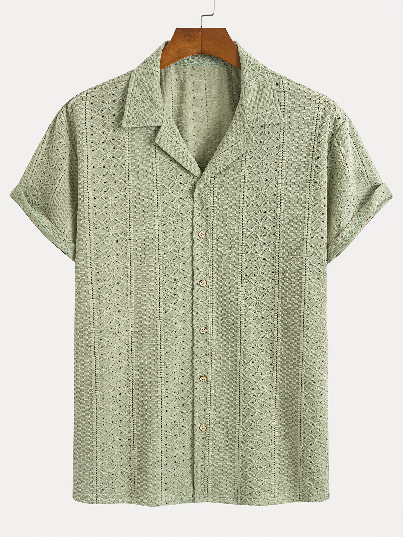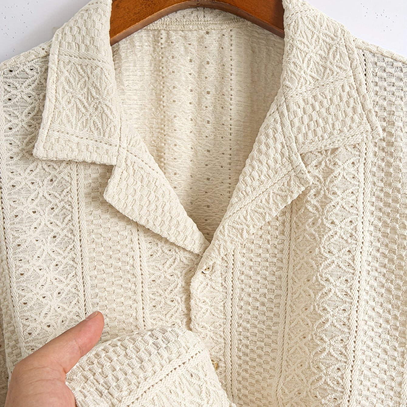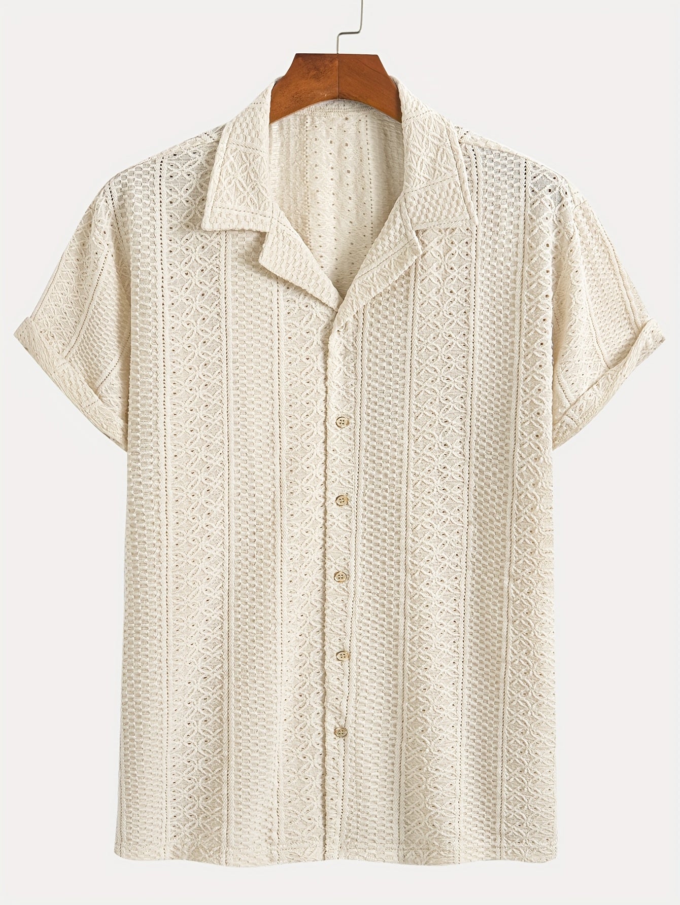 De Atlas Blouse combineert een tijdloos silhouet met een modern jacquard design. Het opengewerkte geometrische patroon zorgt voor een stijlvolle twist en maakt de blouse luchtig en fris, zelfs op warme dagen. Draag ‘m casual met shorts of combineer met een chino voor een verzorgde, urban look.
